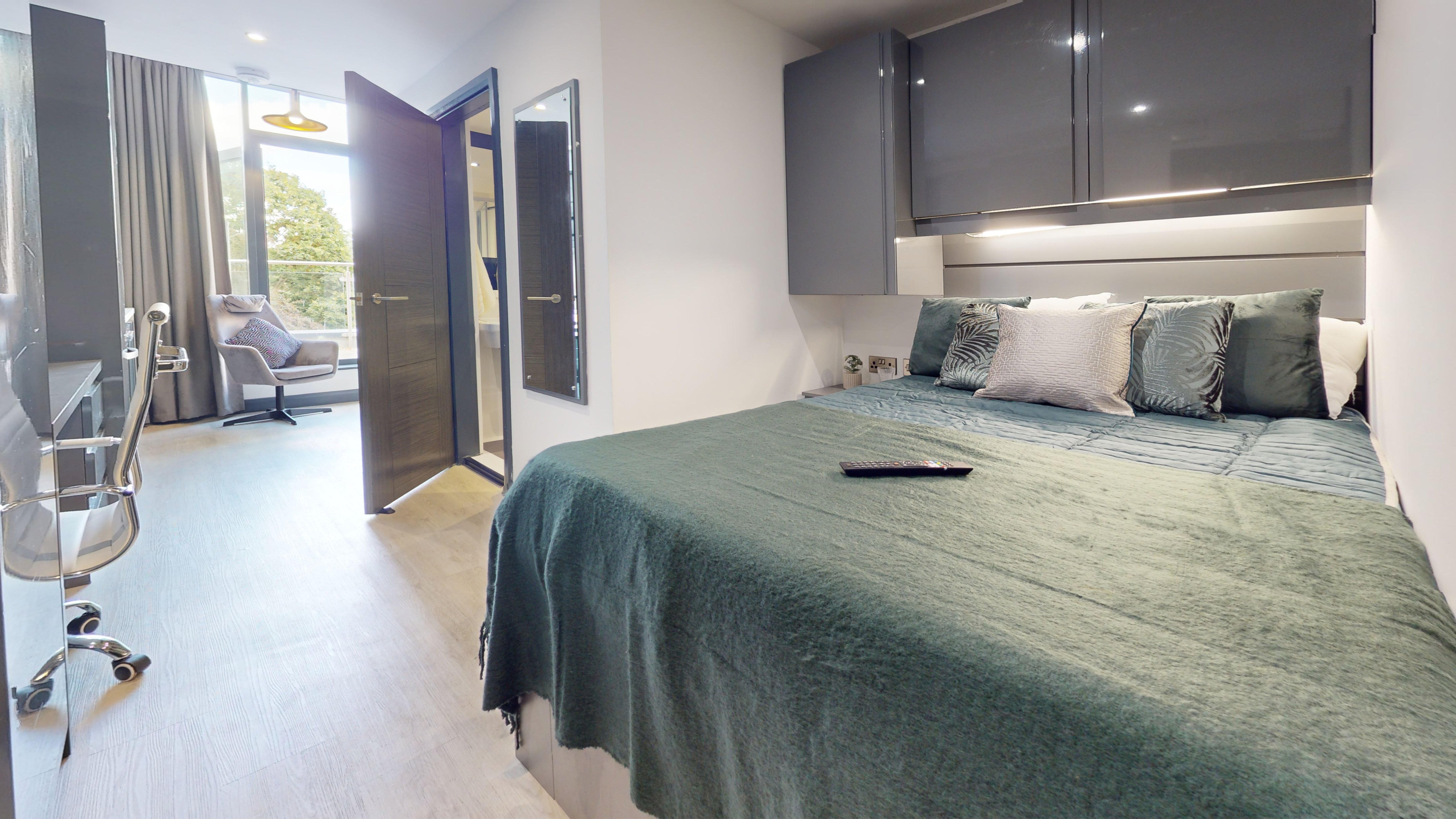 A stylish studio measuring around 20-21m² comes with a three quarter sized bed, dining area, ample storage, study desk and chair and a luxurious balcony. The modern kitchenette comes with a fridge-freezer, microwave oven and hob. This studio also has a fully fitted en-suite containing a shower and stylish fittings. You will also have access to the cinema and games room, and a communal dining room.